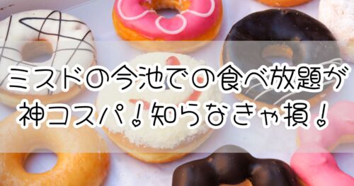 ">ミスタードーナツの食べ放題が、名古屋・今池で楽しめるってご存じですか? 実は一部のミスド店舗では、定番のドーナツや季節限定商品、ドリンクなどが 60分間食べ飲み放題で楽しめる「ドーナツビュッフェ」が実施されているんです。 特に今池エリアはアク…